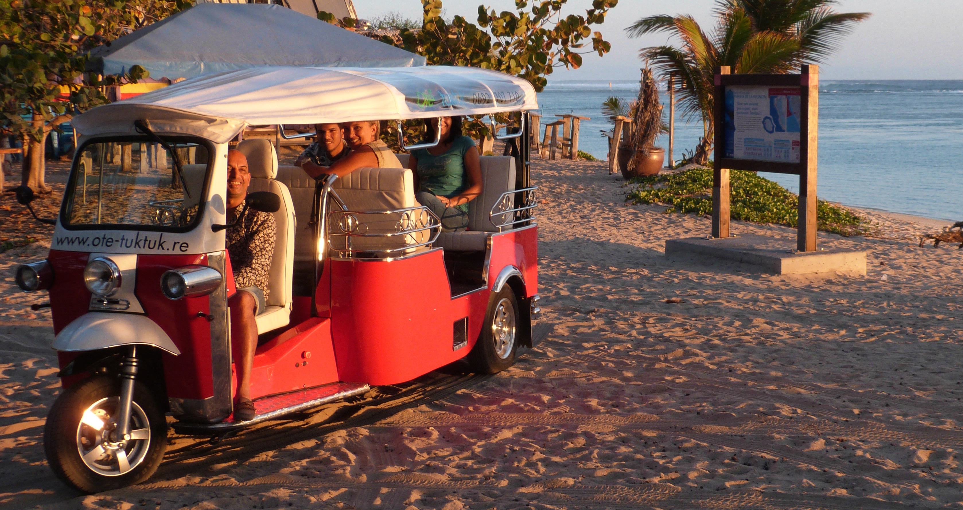 An exclusive arrival of thai tuk tuk on the West coast. Oté Tuktuk, this new product, unique in Reunion island will charm many people with its playfulness. Built in Netherlands with european standards, these vehicles designed with 100% electric engine offer a good comfort. Crafted finishing with sofa seats, seat belts, body without doors and ventilated with a window for the driver, large hood to protect of the sun, chromed frames etc.. Electric vehicles get a battery life of 100 km and move at 50 km/h. The best asset of these motorised tricycles is the ventilated body to move in the open air, with a larger field of vision. We don’t forget the green side for a healthier environment. The driver is alone in front to drive the tuktuk, and the passengers board at the back side on the 2 sofa seats of 3 places each. Oté Tuktuk provide daily shuttles by way of Ermitage hotels, beaches, St Gilles marina, Boucan Canot area.