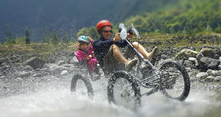 Like mountain biking, this adventure allows you to practice a sport very close to nature without having a special training. If you’re looking for something extraordinary, fun and ecological, then biking is for you: children as well as adults will be able to experience safely new thrills (1m20 to 2m00). All you need is 4 wheels mounted in the chassis of a 27-speed mountain bike, a comfortable seat, pedals and possibility to add a child trailer.