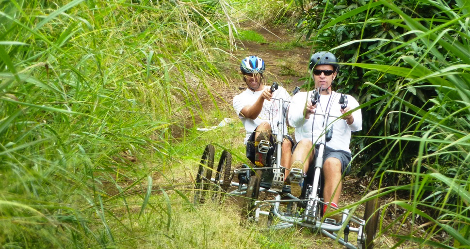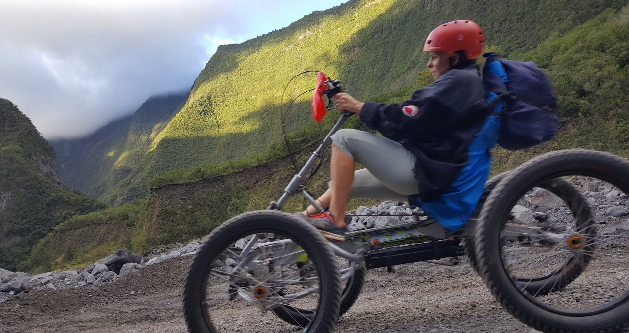 This new product allows you to practice a sport almost entirely downhill, close to nature : without any required training, everyone will enjoy it! The three-wheeled bike is suited to many disabilities or injuries: it’s perfectly safe and stable. It allows you to roll slowly uphill at your own pace, without setting foot on or off the bike. You can even read an IGN map, drink, eat, take pictures, make videos, and change the music on your MP3 while rolling. These bikes have mirrors, bell, safety flag and pedals that don’t stick when you turn. To sump it up, this ecotouristic sport gathers an elongated position with a panoramic vision: Be ready to experience new sensations.