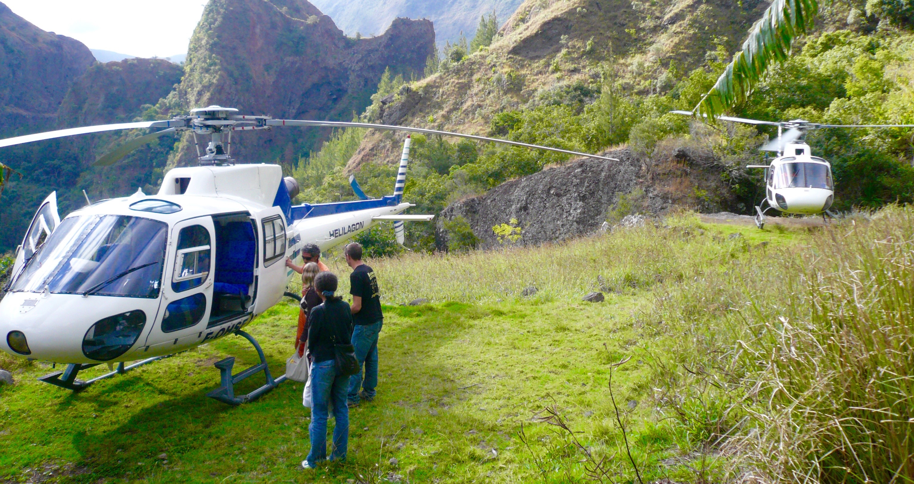 Transfer with a shuttle from your hotel to the heliport of Saint-Gilles. Take off toward the cirque of Mafate, the only cirque unreachable by car. Crossing over the cirque toward Salazie. Stop in front of the «Voile de la Mariée» and entering the «Trou de Fer» by the «Bras des cavernes». This 600 meters deep crack where a river runs throw it offers sensational feelings. Heading to the area of the volcano by flying over the old-growth forest of Bébour and Bélouve. Large loop in the enclosure of the volcano up to the top of the last craters. Then, over flight of the Plaine des Cafres after entering the cirque of Cilaos. Return by the cirque of